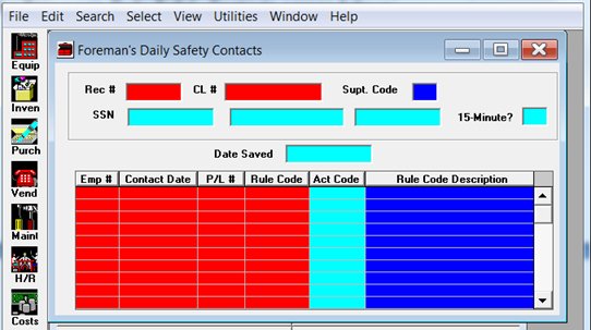 - SAFETY_CONTACT_HIST - Documents the Daily Safety Contacts made by each Supervisor. A screen print of the Foreman's Daily Safety Contacts screen follows: